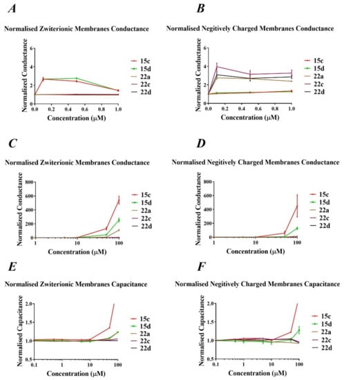 At higher concentrations of the compounds, the changes of membrane conduction were more pronounced, especially for compounds 15c, 15d and 22a in zwitterionic membrane (Figure 7C). Interestingly, these responses were lower in negatively charged membranes (Figure 7D). The significant increases in membrane conduction suggested that these compounds possess lytic or surfactant-like properties on membranes, in which these compounds sequester lipids from the lipid membrane bilayer via micellisation and eventually disintegrate the membrane [].