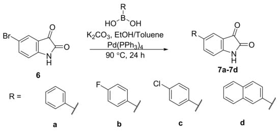 The biphenyl scaffold was incorporated into the molecules by the Suzuki-Miyaura cross-coupling reaction. This was achieved by reacting 5-bromisatin 6 with different commercially available arylboronic acids to afford 5-arylisatins 7 in good yields (57–86%) (Scheme 1).