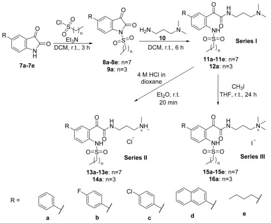 A hydrophobic group was introduced into the scaffold by reacting 5-arylisatins 7a–7d with an alkylsulfonyl chloride and triethylamine as base, furnishing N-alkylsulfonyl compounds 8a–8d and 9a in good yields (52–72%) (Scheme 2). Subsequent nucleophilic ring-opening reaction of N-alkylsulfonyl compounds 8a–8d and 9a with 3-dimethylaminopropylamine 10 afforded the corresponding glyoxamides 11a–11d and 12a as series I compounds in excellent yields (94–99%). The cationic group was installed by treating glyoxamides 11a–11d and 12a with 4 M HCl in dioxane to give tertiary ammonium chloride salts 13a–13d and 14a as series II compounds in 92–99% yields or with methyl iodide in tetrahydrofuran (THF) to give quaternary ammonium iodide salts 15a–15d and 16a as series III compounds in 90–95% yields. The analogous reactions with 5-butylisatin 7e as the starting material generated the corresponding tertiary ammonium chloride salt 13e and quaternary ammonium iodide salt 15e in 99% and 85% yields, respectively.