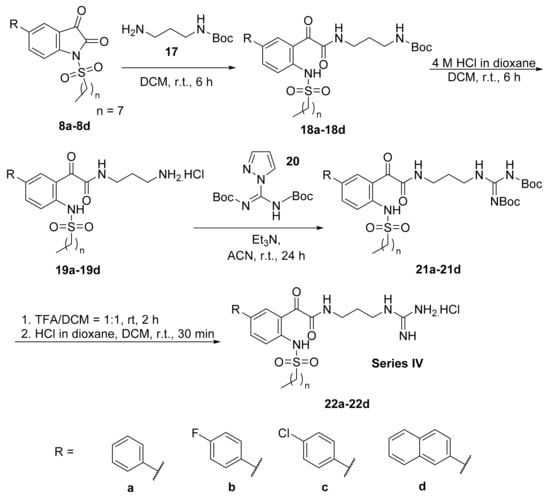 Alternatively, N-octanesulfonyl compounds 8a–8d were also ring-opened with N-Boc-1,3-propanediamine 17 to give Boc-protected glyoxamides 18a–18d in excellent yields (95–97%) (Scheme 3). Boc-protected glyoxamides 18a–18d were treated with 4 M HCl in dioxane to yield aminoglyoxamides 19a–19d in good yields (64–90%). The subsequent guanylation reaction using N,N’-di-Boc-1H-pyrazole-1-carboxamide and triethylamine afforded the corresponding Boc-protected guanidine glyoxamides 21a–21d in moderate to good yields (31–77%). Finally, treating the Boc-protected guanidine glyoxamides 21a–21d with trifluoroacetic acid in dichloromethane (DCM) followed by 4 M HCl in dioxane provided the guanidinium hydrochloride salts 22a–22d as series IV compounds in 50–77% yields.