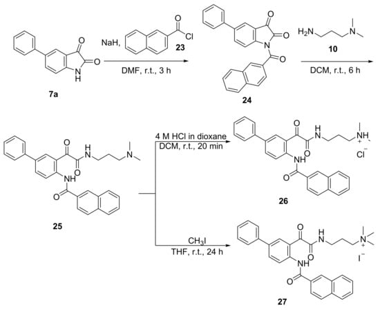 Biphenyl derivatives 25–27 bearing a naphthoyl hydrophobic group in place of the alkylsulfonyl group were also synthesised. Naphthoylation was achieved by treating 5-phenylisatin 7a with sodium hydride and 2-naphthoyl chloride 23 to give the 5-phenyl-N-naphthoylisatin 24 in 35% yield (Scheme 4). The nucleophilic ring-opening reaction of 5-phenyl-N-naphthoylisatin 24 with 3-dimethylaminopropylamine 10 gave amine 25, which was followed by salt conversion into the corresponding tertiary ammonium chloride salt 26 and quaternary ammonium iodide salt 27 in 84% and 79% yields, respectively.