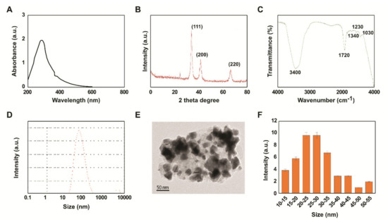 We developed an approach to synthesize PtNPs using beta carotene as templates. In a typical synthesis, 10 mL of 1 mg/mL beta carotene was added to 90 mL of 1 mM H2PtCl6. 6H2O solution and stirred for 30 min at 100 °C. During the reaction, a dark brownish color was formed, which suggested the formation of PtNPs. Further characterization of PtNPs was performed by ultraviolet-visible spectroscopy. PtNPs showed a typical characteristic peak at 290 nm, which confirmed the complete reduction of Pt (IV) ions to PtNPs (Figure 1A). In this study, the synthesis of PtNPs using a biological template was non-toxic, environmentally friendly, and non-hazardous, which was consistent with the reports of previous studies that had used various biomolecules such as Quercus glauca extracts, apigenin, tangeretin, and Saudi’s date extract, to synthesize PtNPs [47,48,49,50].