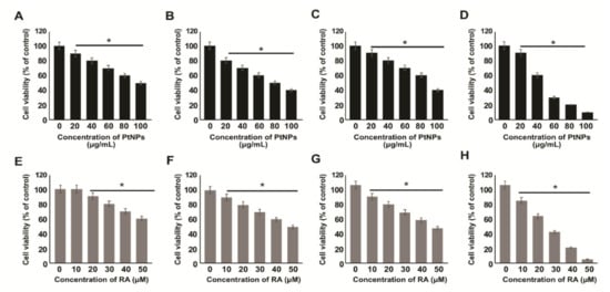 Determination of sensitivity of various type of cancer cells to PtNPs and retinoic acid (RA). Cell viability was determined in various types of cancer cells, including human adenocarcinoma cells (A,E), human breast cancer cells (B,F), human prostate cancer cells (C,G), and human neuroblastoma cells (D,H) treated with various concentrations of PtNPs (20–100 µg/mL) (A–D) or RA (10–50 µM) (E–H) for 24 h. The results are expressed as mean ± standard deviation of three independent experiments. The treated groups showed statistically significant differences from the control group per the Student’s t-test; * p < 0.05 was considered significant, PtNPs, platinum nanoparticles; RA, retinoic acid.
