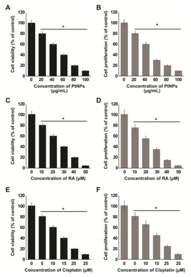 Dose-dependent effect of PtNPs, RA, and cisplatin on cell viability and proliferation of SH-SY5Y cells. The viability of SH-SY5Y cells was determined after 24-h exposure to different concentrations of PtNPs (20–100 µg/mL) (A). Proliferation of SH-SY5Y cells was determined using the BrdU assay after 24-h exposure to different concentrations of PtNPs (20–100 µg/mL) (B). Viability of SH-SY5Y cells was determined after 24-h exposure to different concentrations of RA (10–50 µM) (C). Proliferation of SH-SY5Y cells was determined using the BrdU assay after 24-h exposure to different concentrations of PtNPs (10–50 µM) (D). Viability of SH-SY5Y cells was determined after 24-h exposure to different concentrations of cisplatin (5–25 µM) (E). Proliferation of SH-SY5Y cells was determined using the BrdU assay after 24-h exposure to different concentrations of cisplatin (5–25 µg/mL) (F). The results are expressed as mean ± standard deviation of three independent experiments. The treated groups showed statistically significant differences from the control group per the Student’s t-test; * p < 0.05 was considered significant. PtNPs, platinum nanoparticles; RA, retinoic acid.