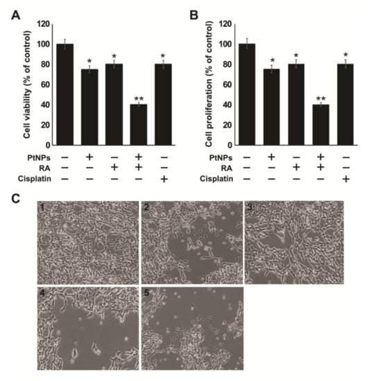 Combination of PtNPs and RA induces loss of cell viability, reduces proliferation, and alters cell morphology in SH-SY5Y cells. SH-SY5Y cells were incubated with PtNPs (25 μg/mL), RA (12.5 μM), combination of PtNPs (25 μg/mL) and RA (12.5 μM), or cisplatin (6.5 μM) for 24 h. Cell viability (A), cell proliferation (B), were determined. The results are expressed as mean ± standard deviation of three independent experiments. The treated groups showed statistically significant differences from the control group per the Student’s t-test; * p < 0.05 was considered significant, ** p < 0.01 was considered highly significant. PtNPs, platinum nanoparticles; RA, retinoic acid. Cell morphology control (1), PtNPs (2), RA (3), combination of PtNPs and RA (4), or cisplatin (5) for 24 h (C). Scale bar-200 µm