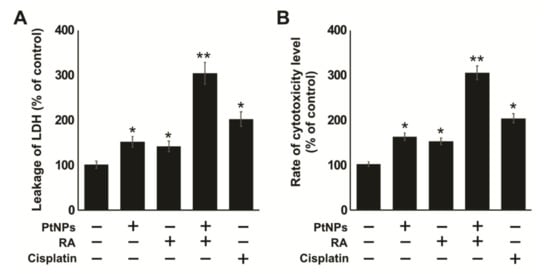 Cells treated with cytotoxic compounds, such as PtNPs, are killed through swelling and the loss of membrane integrity, after which they shut down and release their intracellular contents into the surrounding environment. When the cell membranes are compromised, lactate dehydrogenase (LDH), a soluble, stable enzyme and a typical marker of cell death, is released into the surrounding extracellular space. To determine the effect of PtNP and RA combination, SH-SY5Y cells were treated with PtNPs, RA, or PtNPs and RA for 24 h, and the LDH level was measured. The results showed that the effect of PtNP and RA combination was significantly stronger than that of PtNPs or RA, and LDH level was 3-fold higher than that with individual treatment (Figure 5A). Cisplatin showed moderate effect compared with the control. These findings clearly suggest that the cell membrane integrity was severely compromised by PtNPs and RA. For example, when T47D cells were exposed to tamoxifen and simvastatin combination, the leakage of LDH was significantly higher than that observed with the control treatment [62]. We have previously reported that treatment with the combination of silver nanoparticles and histone deacetylase inhibitors significantly increases the leakage of LDH, compared with that on individual treatment of human alveolar basal epithelial cells [63]. Collectively, the release of LDH suggests that necrosis as well as necroptosis could be involved in PtNP- and RA-induced SH-SY5Y cell death.