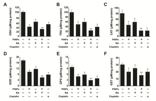 Alteration of the balance of antioxidants/oxidants has a significant role in the pathogenesis of different kinds of tumors [87]. Enzymatic antioxidants play critical roles against oxidative stress. To evaluate the impact of PtNPs and RA on various antioxidant levels, SH-SY5Y cells were treated with PtNPs, RA, PtNPs and RA, or cisplatin for 24 h. All the tested antioxidants such as glutathione (GSH), thioredoxin (TRX), catalase (CAT), superoxide dismutase (SOD), glutathione peroxidase (GPx), and glutathione S-transferase (GST) were clearly downregulated in the treated cells, particularly, the combination of PtNPs and RA significantly and strongly downregulated the antioxidants by up to 3-fold compared with single PtNPs, RA, or cisplatin treatment. As shown in Figure 7, GSH levels in SH-SY5Y cells treated with PtNPs, RA, and cisplatin for 24 h were 40, 60, and 50 μM GSH, respectively, whereas exposure of the cells to the combination of PtNPs and RA for 24 h resulted in significant reduction in GSH level (30 μM). The same trend was observed for the TRX contents, which were 25, 50, 60, and 40 μM in the cells treated with PtNPs and RA, PtNPs, RA, and cisplatin for 24 h, respectively. In addition, antioxidants levels of CAT and SOD declined; the levels of CAT in SH-SY5Y cells exposed to the combination of PtNPs and RA, PtNPs, RA, and cisplatin for 24 h were 20, 40, 50, and 20 μM, respectively. Similarly, the SOD contents were 6, 10, 12, and 8 μM in cells treated with PtNPs and RA, PtNPs, RA, and cisplatin for 24 h, respectively (Figure 7).
