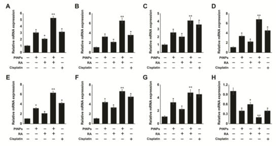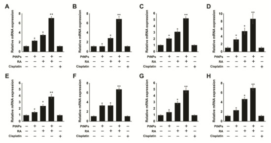 Effect of cisplatin on undifferentiated and differentiated SH-SY5Y cells. SH-SY5Y cells were pre-incubated with PtNPs (25 μg/mL), RA (12.5 μM), or the combination of PtNPs (25 μg/mL) and RA (12.5 μM) for 24 h. After preincubation, cisplatin (6.5 μM) was added to the cells. We examined the expression of various neuronal markers of differentiation, including MAP2 (A), beta-tubulin III (B), neurogenin (C), GAP-43 (D), DRD2 (E), neurofascin (F), neuropilin 1 (G), and gamma neuronal (H) in SH-SY5Y cells exposed for 24 h. The relative expression levels of all the genes were increased by 4–8 folds after treatment with PtNPs and RA. The results are expressed as mean ± standard deviation from three independent experiments. There was a significant difference between treated cells and untreated cells per Student’s t-test (* p < 0.05). The treated groups showed statistically significant differences from the control group per the Student’s t-test; * p < 0.05 was considered significant, ** p < 0.01 was considered highly significant.