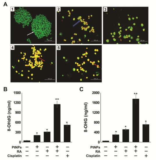 Oxidative stress-induced DNA and RNA damage include oxidized DNA bases as well as DNA single strand and double strand breaks. Guanine is the most susceptible to oxidation by ROS, resulting in the generation of 8-oxoguanine [111]. Thus, we examined the levels of 8-hydroxy-2-deoxyguanosine (8-OHdG) and 8-hydroxyguanosine (8-OHG) in SH-SY5Y cells exposed to PtNPs, RA, PtNPs and RA, and cisplatin for 24 h, and the results revealed that the accumulation rate of 8-OHdG (1100 ng/mL) was significantly higher, compared with that of either PtNPs (200 ng/mL) or RA treatment alone (300 ng/mL). However, the accumulation of 8-OHdG was remarkably higher (1700 ng/mL) in cells treated with PtNPs and RA than in those treated singly with either PtNPs (300 ng/mL) or RA (500 ng/mL) (Figure 10B,C). For example, DNA damage was induced in BALB/c 3T3 fibroblasts exposed to gold nanoparticles through an indirect mechanism triggered by oxidative stress [112], and severe oxidative damage to DNA and accumulation of 8-OHdG and 8-OHG SH-SY5Y were observed in cells exposed to silver nanoparticles [49]. It has also been reported that TiO2NP induced ROS-mediated oxidative stress, the activation of p53, Bax, and caspase- 3, and oxidative DNA damage in HEK-293 cells [113]. Similarly, human hepatocytes and embryonic kidney cells exposed to zinc oxide nanoparticles exhibited altered cellular morphology, mitochondrial dysfunction, increased levels of oxidative stress markers, and oxidative DNA damage [114]. HaCaT cells treated with silicon dioxide NPs exhibited increased level of ROS, DNA damage, and apoptosis in size- and concentration-dependent manners [115]. Similarly to other metallic NPs, PtNPs induced oxidative DNA damage in human cancer cells, including human monocytic THP-1 cells [48]. The combination of PtNPs and doxorubicin caused significant oxidative DNA damage and induced the accumulation of 8-OHdG and 8-OHG in osteosarcoma cancer cells [49]. Altogether, these results clearly support that the combination of PtNPs and RA can potentially induce DNA damage.