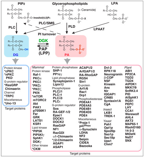 Target proteins of substrate (DG) and reaction product (PA) of DGK. Asterisks indicate target proteins that have been strongly suggested to be regulated by DGK isoforms through consumption of DG or production of PA. PAP, PA phosphatase; LPP, lipid phosphate phosphatase; PC, phosphatidylcholine; PI, phosphatidylinositol; PIP2, PI 4,5-bisphosphate; PLC, phospholipase C; PLD, phospholipase D; cPKC, conventional protein kinase C (PKCα, β and γ); nPKC, novel PKC (PKC δ, ε, η and θ); PKD, protein kinase D; Unc-13, uncoordinated-13; RasGRP, Ras guanyl nucleotide-releasing protein; TRPC, transient receptor potential channel; chimaerin (RacGAP); Raf-1/C-Raf, rapidly accelerated fibrosarcoma (serine/threonine protein kinase); PKCζ (atypical PKC (aPKC)); PKN (aPKC); mTOR, mammalian target of rapamycin (serine/threonine protein kinase); mTORC2, mTOR complex 2; Akt/protein kinase B; PAK1, p21-activated kinase 1; p70S6K1/S6K1, ribosomal protein S6 kinase β-1; Fer (tyrosine protein kinase); GRK, G protein-coupled receptor kinase; LATS1, large tumor suppressor kinase 1; KSR1, kinase suppressor of Ras 1 (serine/threonine protein kinase/scaffold protein); PIP5K, PI-4-phosphate 5-kinase; SphK1, sphingosine kinase 1; CKM, creatine kinase-muscle type; SHP-1, Src homology 2 domain-containing protein-tyrosine phosphatase 1; PP1c, protein phosphatase-1 catalytic subunit; synaptopjanin-1 (PI(4,5)P2-5-phosphatase); lipin1β (PAP); Sos, son of sevenless (Ras guanyl nucleotide exchange factor (GEF)); RA-GEF-1/2/PDZ-GEF (Rap1GEF); Epac1 (RapGEF); DOCK, dedicator of cytokinesis (RacGEF); RasGAP, Ras GTPase-activating protein; NF1, neurofibromatosis type-1 (RasGAP); RacGDI, Rac guanosine dissociation inhibitor; AGAP (ADP-ribosylation factor (Arf) 1 GAP); ASAP1 (Arf1GAP); ACAP1/2 (Arf6GAP1/2); RA-RhoGAP, Rap-activated RhoGAP; RGS, regulator of G-protein signaling protein; Sin1, SAPK-interacting protein 1 (suppressor of Ras signaling); Arf, ADP-ribosylation factor; Rac1, Ras-related C3 botulinum toxin substrate 1 (Rho family, small GTP binding protein); Drp1, dynamin-related protein 1 (dynamin superfamily GTPase); PDE, cAMP phosphodiesterase; Praja-1 (E3 ubiquitin ligase acting on serotonin transporter); p47phox (component of NADPH oxidase); α-synuclein (associated with Parkinson’s disease); NF2 (Hippo upstream component); seipin (role in lipid droplet formation); CIDEA, cell-death-induced DFF45-like effector A (lipid droplet protein); Bazooka/Par-3 (cell polarity regulator); Dvl-2, dishevelled homolog (mediator of the Wnt signaling pathway); RPK118 (SphK1-binding protein); Neurogranin (calmodulin-binding protein); β-COP (coatmer protein); NSF, N-ethylmaleimide-sensitive factor (ATPase associated with diverse cellular activity (AAA)); Kinesin (motor protein); Anc, adenine nucleotide carrier protein; Nir (PI-transfer protein); IQGAP1, IQ motif-containing guanosine triphosphatase-activating protein 1 (scaffold protein); CIN85, Cbl-interacting protein of 85 kDa (adaptor/scaffold protein); syntaxin1A (soluble NSF attachment protein receptor (SNARE) protein); CgA, chromogranin A (a representative constituent of the core aggregate within secretory granules); LKB1, liver kinase B1 (serine/threonine protein kinase); TREK-1, TWIK-related K+ channel type 1 (potassium channel); Pah1 (PAP); Opi1p (transcriptional repressor); Spo20p (SNARE protein); Sso1p (SNARE protein); Sec18p/NSF (AAA); Ups1 (mitochondrial fusion protein in the inner membrane); Chm7 (part of an ESCRT-III-like complex); ABI1, ABA-insensitive 1 (protein phosphatase); PP2CA, protein phosphatase 2CA; TGD, trigalactosyldiacylglycerol (chloroplast lipid transport protein); AtPDK1 (Arabidopsis thaliana 3-phosphoinositide-dependent protein kinase-1); MKK7/9 (mitogen-activated protein kinase kinase 7/9); SnRK2.4, sucrose nonfermenting-1-related protein kinase 2.4; PID, protein kinase PINOID (regulator of auxin signaling); AtSphK1, Arabidopsis thaliana sphingosine kinase 1; PEPC, phosphoenolpyruvate carboxylase; LHY (late elongated hypocotyl, transcription factor involved in the circadian clock); CCA1 (circadian clock associated 1, transcription factor involved in the circadian clock); Werewolf (MYB transcription factor); AHL4, AT-hook motif nuclear localized protein 4 (transcription factor to regulate triacylglycerol degradation for seeding establishment); AKT2, potassium channel; MAP65-1, microtubule-associated protein 65-1; RbohD160, respiratory burst oxidase homolog D 160; 14-3-3 protein (member of a family of regulatory molecules); MtDef4, Medicago truncatula defensin 4; NsD7, Nicotiana suaveolens defensin 7; SNX, sorting nexin (suppressing vascular degradation).