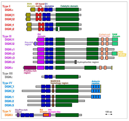 Mammalian DGK family proteins. Alternative splice variants are also shown. MARCKS, myristoylated alanine-rich C-kinase substrate; PDZ, postsynaptic density 95, discs large, zonula occludens-1; PH: pleckstrin homology; RA, Ras-associated; RVH, recoverin homology; SAM, sterile α-motif.