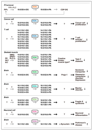 Successive genome-wide association studies (GWASs) indicated a possible relationship between single nucleotide polymorphisms (rs9315885, rs1012053 and rs1170191) of DGKH (DGKη gene) and BPD [222,223,224,225,226]. Indeed, DGKη-KO mice exhibited BPD mania-like phenotypes [227]. Moreover, microarray analysis showed that mRNA levels of prolactin and growth hormone, which are augmented in BPD patients and BPD model animals, are most strongly increased [228]. Furthermore, it was revealed that the amount of dopamine is augmented in the DGKη-deficient mouse brain [Asami, M. and Sakane F. unpublished work]. The levels of polyunsaturated fatty acid (PUFA)-containing PA species such as 18:1/18:2-, 18:0/20:3-, 18:0/22:5-, 18:0/22:4-, and 18:0/22:3-PA were recently found to be decreased in the DGKη-KO brain (Figure 3) [228], suggesting that DGKη generates these PUFA-containing PA species in the brain.