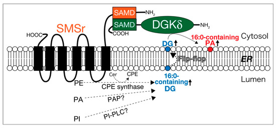 Sphingomyelin synthase-related protein (SMSr) is a six-transmembrane protein in the endoplasmic reticulum (ER), which generates DG and ceramide phosphoethanolamine (CPE) by utilizing phosphatidylethanolamine (PE) and ceramide (Figure 4) [269]. A SAM domain in SMSr form a homo-oligomer [270,271]. DGKδ also possesses a SAM domain and forms homo-oligomers via the domains [112,113]. Intriguingly, the SAM domains in SMSr and DGKδ are primary structurally similar to each other [270,271]. It is noteworthy that we recently found that SMSr and DGKδ interacted with each other through their SAM domains (Figure 4) [272]. Moreover, overexpression of both SMSr and DGKδ, but not DGKδ or SMSr alone, enhanced PA production in COS-7 cells. In particular, the levels of 16:0- and/or 16:1-containing PA species including 16:1/16:1-PA, 16:0/16:1-PA, 16:0/16:0-PA, 16:1/18:1-PA, and 16:0/18:1-PA, which were also produced by DGKδ in high glucose-stimulated C2C12 myoblast cells [76], were significantly increased. Moreover, SMSr overexpressed in COS-7 cells generated 16:0- and/or 16:1-containing DG species [272]. Taken together, these results strongly suggest that SMSr acts upstream of DGKδ and supplies limited species of DG to DGKδ (Figure 4). Although SMSr produces DG at the lumen side of the ER, DGKδ2 exists in the cytosol [112,113]. However, DG quickly diffuses across the lipid bilayer by the flip-flop mechanism (Figure 4) [273]. Therefore, it is likely that the DG produced by SMSr immediately transverses the ER membrane from the lumen side to the cytosol leaflet and, consequently, is provided to DGKδ (Figure 4).