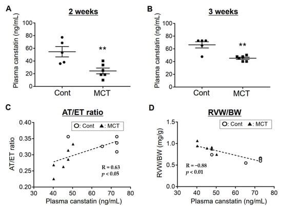 Eight-week-old male Wistar rats were injected with monocrotaline (60 mg/kg, i.p., MCT) to establish the PAH model, as described previously []. Control rats were injected with the same volume of saline (Cont). Three weeks after monocrotaline injection, a decrease in acceleration time (AT)/ejection time (ET) ratio and increase in lung weight (LW) and RV weight (RVW), commonly observed features in a rat model of monocrotaline-induced PAH [,], were confirmed (Table 1). The plasma concentration of canstatin in PAH rats (2 weeks: 24.4 ± 4.5 ng/mL, 3 weeks 45.3 ± 1.7 ng/mL) was significantly decreased compared with Cont (2 weeks: 54.7 ± 8.2 ng/mL, 3 weeks: 66.4 ± 4.9 ng/mL) (p < 0.01, Figure 1A,B). In addition, we evaluated the correlation between plasma concentration of canstatin and pathological conditions of PAH rats. Three weeks after monocrotaline injection, the plasma concentration of canstatin in PAH rats was positively correlated with a reduction in AT/ET ratio (R = 0.63, p < 0.05, Figure 1C) and negatively correlated with an increase in RVW/body weight (BW) (R = −0.88, p < 0.01, Figure 1D).