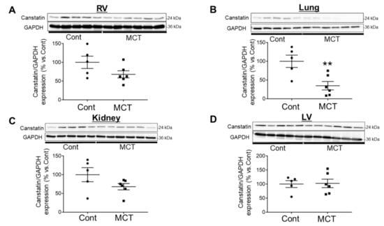 The protein expression of canstatin in PAH rats was decreased in RV (68.0 ± 9.5% vs. Cont) (p = 0.11, Figure 2A), lung (34.8 ± 11.3% vs. Cont) (p < 0.01, Figure 2B) and kidney (67.9 ± 8.4% vs. Cont) (p = 0.13, Figure 2C) but not left ventricle (LV; 102.4 ± 15.1% vs. Cont) (Figure 2D) or liver (113.1 ± 10.1% vs. Cont) (Figure S1).