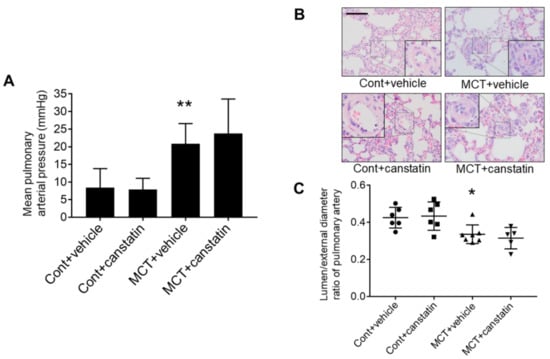In MCT, AT/ET ratio was significantly decreased (p < 0.01 vs. Cont + vehicle), which was not affected by canstatin (Table 2). In MCT, mean PA pressure was significantly increased (p < 0.01 vs. Cont + vehicle), which was not affected by canstatin (Figure 3A). In MCT, LW was significantly increased (p < 0.01 vs. Cont + vehicle), which was not affected by canstatin (Table 2). In MCT, luminal diameter/external diameter ratio was significantly decreased (p < 0.05 vs. Cont + vehicle), which was not affected by canstatin (Figure 3B,C).
