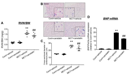 RV hypertrophy and dysfunction are the major comorbidity of PAH []. Thus, we next examined the effects of canstatin on RV hypertrophy. In MCT, RVW (p < 0.01 vs. Cont + vehicle), RVW/BW ratio (p < 0.01 vs. Cont + vehicle) and RVW/LV weight (LVW) ratio (p < 0.01 vs. Cont + vehicle) were significantly increased, which were significantly inhibited by canstatin (p < 0.01 vs. MCT + vehicle) (Figure 4A, Table 2). In histological experiments, in MCT, cardiomyocyte hypertrophy was significantly induced in RV tissue (p < 0.01 vs. Cont + vehicle), which was significantly inhibited by canstatin (p < 0.01 vs. MCT + vehicle) (Figure 4B,C). We also examined the effects of canstatin on mRNA expression of hypertrophy-related gene (BNP) by quantitative real-time polymerase chain reaction (qRT-PCR). In MCT, mRNA expression of BNP was significantly increased (p < 0.01 vs. Cont + vehicle), which was significantly inhibited by canstatin (p < 0.01 vs. MCT + vehicle) (Figure 4D).