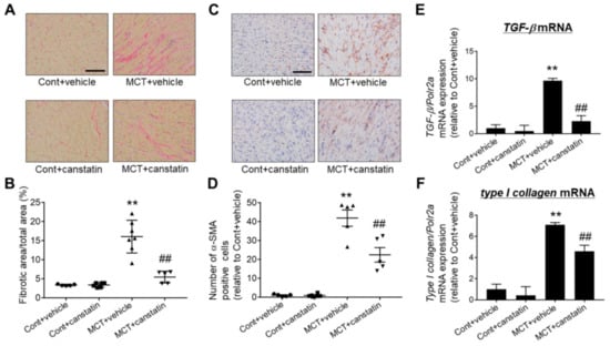 RV fibrosis is observed in a rat model of monocrotaline-induced PAH []. Thus, we examined the effects of canstatin on RV fibrosis by picrosirius red staining. In MCT, the fibrotic area was significantly increased in RV (p < 0.01 vs. Cont + vehicle), which was significantly inhibited by canstatin (p < 0.01 vs. MCT + vehicle) (Figure 5A,B). Myofibroblasts, characterized by an abundant expression of α-smooth muscle actin (α-SMA), play critical roles during the development of fibrosis in various organs including the heart [,]. It was reported that the number of myofibroblasts mainly differentiated from fibroblasts was increased in pathologically fibrotic RV tissue in a rat model of monocrotaline-induced PAH []. Thus, we examined the effects of canstatin on the number of myofibroblasts by immunohistochemical staining against α-SMA. In MCT, the number of myofibroblasts was significantly increased in RV (p < 0.01 vs. Cont + vehicle), which was significantly inhibited by canstatin (p < 0.01 vs. MCT + vehicle) (Figure 5C,D). We also examined the effects of canstatin on mRNA expressions of fibrosis-related genes (transforming growth factor-β (TGF-β) and type I collagen) by qRT-PCR. In MCT, mRNA expression of TGF-β and type I collagen was significantly increased (p < 0.01 vs. Cont + vehicle), which was significantly inhibited by canstatin (p < 0.01 vs. MCT + vehicle) (Figure 5E,F).
