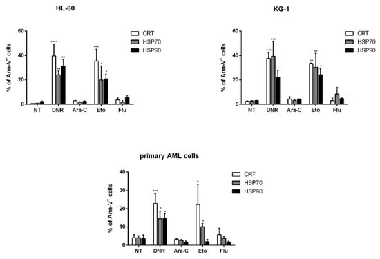 Flow cytometry analysis of calreticulin (CRT) and heat-shock protein (HSP) translocation on the cell-surface of acute myeloid leukemia (AML) cells after chemotherapy treatment. The HL-60, KG-1 and primary AML cells were treated with daunorubicin (DNR) (500 ng/mL), cytarabine (Ara-C) (20 µg/mL), etoposide (Eto) (20 µg/mL) and fludarabine (Flu) (70 µg/mL) for 24 h. The percentage of CRT+, HSP70+ and HSP90+ cells (gated on apoptotic Ann-V+ cells) was analyzed by flow cytometry. Un-treated cells (no treatment; NT) were used as a negative control. The values are represented as mean ± SEM of 5 independent experiments. * p <0.05; ** p < 0.01; *** p < 0.001; **** p < 0.0001 compared to un-treated cells.