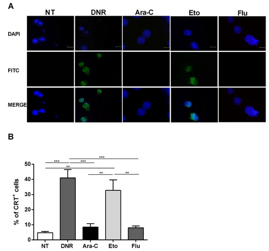 Immunofluorescence analysis of calreticulin (CRT) translocation on the cell-surface of HL-60 cell lines after chemotherapy treatment. The HL-60 cells were treated or not (no treatment; NT) with daunorubicin (DNR) (500 ng/mL), cytarabine (Ara-C) (20 µg/mL), etoposide (Eto) (20 µg/mL) and fludarabine (Flu) (70 µg/mL) for 24 h. (A) The localization of CRT (FITC-conjugated) at cell membrane level with respect to the nucleus (DAPI-conjugated) was evaluated by immunofluorescence microscopy. One representative experiment for each drug is reported. Bar 20 µm. (B) Quantitative analysis of CRT+ cells by immunofluorescence. A total of 100 cells were used for the quantification. ** p < 0.01; *** p < 0.001.