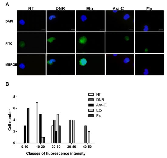 Immunofluorescence analysis of non-histone chromatin-binding protein high mobility group box 1 (HMGB1) release from the nucleus of HL-60 cell lines after chemotherapy treatment. The HL-60 cells were treated or not (no treatment; NT) with daunorubicin (DNR) (500 ng/mL), cytarabine (Ara-C) (20 µg/mL), etoposide (Eto) (20 µg/mL) and fludarabine (Flu) (70 µg/mL) for 24 h. (A) The release of HMGB1 (FITC-conjugated) from nucleus (DAPI-conjugated) to cytoplasm and then extracellular space was visualized by immunofluorescence microscopy. One representative experiment for each drug is reported. Bar 20 µm. (B) Quantitative analysis of HMGB1 fluorescence intensity outside the nucleus in un-treated and treated HL-60 cells. A representative field was used for quantification. The signal outside the nucleus was measured by densitometry (n = 21; randomly selected cells). The cells are grouped in classes of fluorescence intensity and plotted relative to HMGB1 expression.