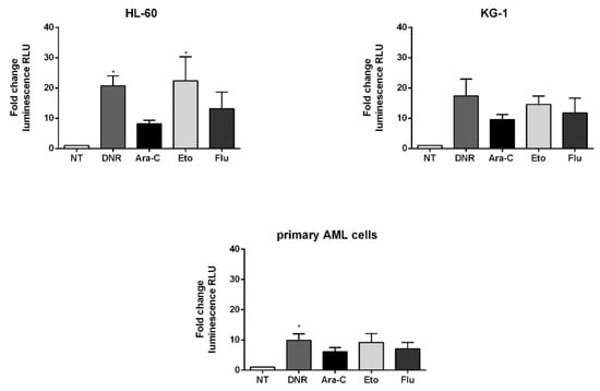A similar trend of higher ATP release after DNR and Eto treatment was observed also for KG-1 cells (Figure 5). Finally, a significant ATP release was observed after DNR treatment in primary AML cells (fold change of luminescence 9.9 ± 2.9) compared to un-treated cells (p < 0.05), whereas both Ara-C and Flu treatment showed a lower capacity to induce ATP release (Figure 5).