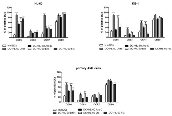 Flow cytometry analysis of dendritic cell (DC) maturation mediated by HL-60, KG-1 and primary AML cells treated with chemotherapy. The HL-60, KG-1 and primary AML cells were treated with daunorubicin (DNR) (500 ng/mL), cytarabine (Ara-C) (20 µg/mL), etoposide (Eto) (20 µg/mL) and fludarabine (Flu) (70 µg/mL) for 4 h and loaded in immature (imm) DCs for another 20 h. The DC phenotype was evaluated by flow cytometry. Un-loaded immature immDCs were used as a negative control. The values are represented as mean ± SEM of 5/3/3 independent experiments for HL-60/KG-1/primary AML cells, respectively. * p < 0.05; ** p < 0.01; *** p < 0.001; **** p < 0.0001 compared to immDCs.