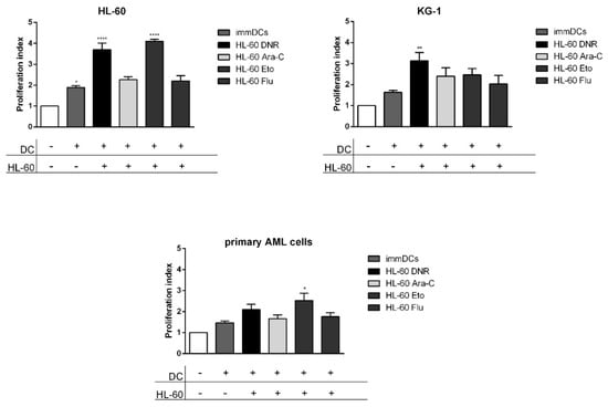 Flow cytometry analysis of CD3+ T-cell proliferation mediated by dendritic cells (DCs) loaded with chemotherapy-treated HL-60, KG-1 and primary AML cells. The HL-60, KG-1 and primary AML cells were treated with daunorubicin (DNR) (500 ng/mL), cytarabine (Ara-C) (20 µg/mL), etoposide (Eto) (20 µg/mL) and fludarabine (Flu) (70 µg/mL) for 4 h and loaded in immature DCs (immDCs) for 24 h. After 24 h, un-loaded immDCs or DCs loaded with treated HL-60, KG-1 and primary AML cells were used as a stimulus for CD3+ T cells for 5 days. The proliferation index of CD3+ T cells was then analyzed by flow cytometry and expressed as fold change. Un-stimulated CD3+ T cells were used as reference and set as 1. The values are represented as mean ± SEM of 5/3/3 independent experiments for HL-60/KG-1/primary AML cells, respectively. * p < 0.05; ** p < 0.01; **** p < 0.0001 compared to un-stimulated CD3+ T cells.