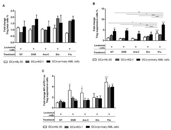 As shown in Figure 8A, none of the tested drugs significantly induced a total population of Tregs, but, interestingly, Flu induced a significant number of suppressive Tregs (Figure 8B), as compared to other drugs. In particular, DCs loaded with HL-60 cells treated with Flu induced 3.5 ± 0.8 (fold change) of suppressive Tregs compared to un-loaded DCs (p < 0.0001) or DCs loaded with DNR-/Ara-C/Eto-treated HL-60 cells (0.9 ± 0.2/1.1 ± 0.1/1.6 ± 0.4, respectively; p < 0.05/p < 0.001/p < 0.0001). A similar pattern was observed when DCs loaded with primary AML cells treated with Flu (fold change 7.5 ± 0.5) were used for Tregs induction compared to un-loaded DCs (p < 0.0001) (Figure 8B). Similarly to HL-60 cells, DCs loaded with primary cells treated with Flu also induced a significant up-regulation of suppressive Tregs compared to DNR/Ara-C/Eto (p < 0.05/p < 0.0001/p < 0.0001, respectively). For DCs loaded with Flu-treated KG-1 cells, only a trend in suppressive Tregs up-regulation was observed (fold change 2.7 ± 0.1). Moreover, a more in-depth characterization of Flu-induced suppressive Tregs revealed an up-regulation of programmed cell death protein 1 (PD-1) expression indicating their potentiality and effector function (Figure 8C). The fold change of the mean of fluorescence intensity (MFI) of PD-1 expressed on suppressive Tregs increased to 4.9 ± 0.7, when DCs loaded with Flu-treated HL-60 were used (p < 0.0001 compared to unloaded DCs). Similarly, DCs loaded with KG-1 or primary AML cells also induced a significant up-regulation of PD-1 MFI on suppressive Tregs to 3.9 ± 0.3 or 4.0 ± 0.3, respectively (fold change), after Flu treatment compared to un-loaded DCs (p < 0.05 or p < 0.01, respectively) (Figure 8C). Interestingly, we observed an up-regulation of PD-1 also after DNR and Ara-C, but not Eto treatment, when DCs loaded with HL-60 cells were used to induce Tregs. These data are in line with previously obtained results highlighting the contrasting immunological effect of Flu and Eto treatment.