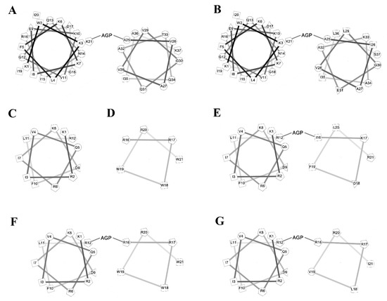To investigate the amphipathic helix–AGP–hydrophobic helix on the antimicrobial and neutralization activities of LPS, two peptides KR12 and RW6 were used for the N-terminal and C-terminal helices. KR-12 (KRIVQRIKDFLR) was derived from human host defense cathelicidin LL-37 and was found to possess antimicrobial activities against Gram-negative and Gram-positive bacteria. RW6 (RRWWRW) was derived from the reversed sequence of WR6 (WRWWRR) which had moderate antimicrobial activities [47,48,49,50]. Sequences of the designed peptides are listed in Table 1 and their helical wheel analyses are shown in Figure 1. KR12AGPKR6 was named based on the “KR12–AGP–KR6 sequence”. KR12AGPWR6 was named based on the “KR12–AGP–WR6 sequence”. KR12AGPVR6 were named based on the “KR12–AGP–VR6 sequence”. KR12AGPKR6, KR12AGPWR6 and KR12AGPVR6 were designed to compare the effects of hydrophobicity, membrane-permeability, and α-helical contents. All peptides were acetylated and amidated at the N- and C-terminus.