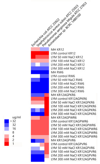 Minimal inhibitory concentration (MIC) values were displayed on a color scale for KR12, RW6, KR12AGPKR6, KR12AGPWR6 and KR12AGPVR6 under Mueller−Hinton (MH) broth and LYM medium with different concentrations of NaCl.