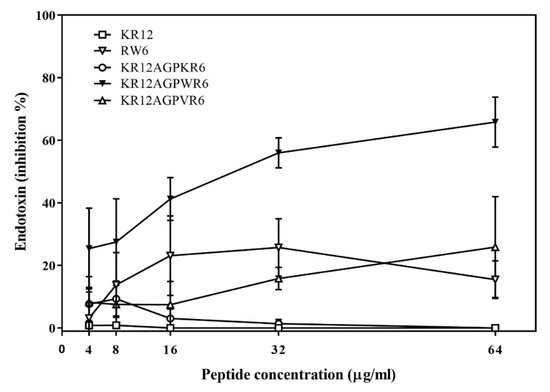 The ability of binding and neutralizing LPS in vitro was measured by the LAL assay which is well-known as the most sensitive and specific method [29,33,49,51]. As shown in Figure 3, KR12AGPWR6 blocked the interaction between LPS and factor C (an LPS sensitive serine protease isolated from the hemocyte granules of the horseshoe crab Limulus), and neutralized the downstream reaction dose-dependently (greater than 60% inhibition at 64 μg/mL). KR12, RW6, KR12AGPKR6 and KR12AGPVR6 had only limited effects (less than 25% inhibition at 64 μg/mL).