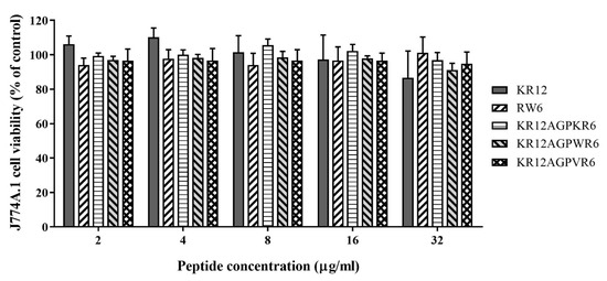Cytotoxicity of the designed peptides was evaluated by MTT assay using murine macrophage J744A.1 cells. RW6, KR12AGPKR6, KR12AGPWR6, and KR12AGPVR6 all exhibited little or even no cell toxicity (Figure 4). However, KR12 showed greater toxicity at 64 μg/mL (cell survival rate less than 40%).
