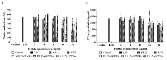 Inhibition of (A) LPS-induced nitric oxide (NO) production and (B) TNF-α release by the designed peptides with 2–32 μ-/mL working concentration in murine macrophage J774A.1 cells. Data are representative of at least three independent experiments and results are presented as means ± standard deviations. * p < 0.05; ** p < 0.01; *** p < 0.001, student’s t-test versus LPS.