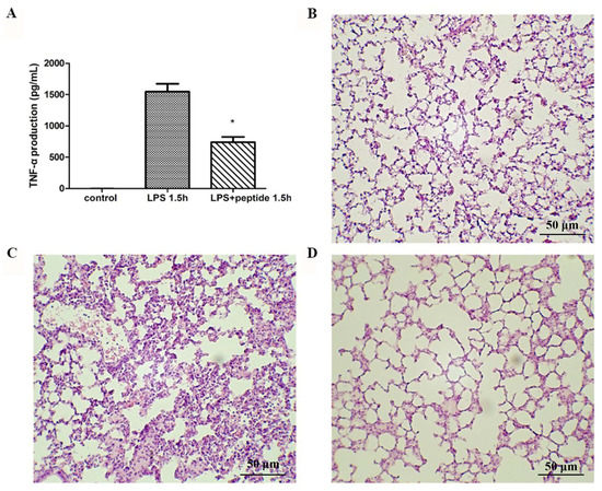 Suppression of LPS-stimulated inflammation in endotoxemic mice (C57BL/6) by KR12AGPWR6. (A) LPS-stimulated TNF-α release 1.5 h after injection. Excised lungs from the sacrificed mice 24 h after injection were subjected to H&E staining (B) control, (C) LPS (D) LPS and peptide. KR12AGPWR6 displayed the protective activity on LPS-stimulated endotoxemic mice. All scale bars = 50 μm. Results are presented as means ± standard deviations (SD); n = 5. * p < 0.05 versus LPS.