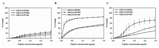 When peptides lysed or disrupted lipid membrane, the entrapped calcein got released into the buffer. All three peptides displayed weak leakages on POPC/cholesterol LUVs (Figure 7A). KR12AGPKR6, KR12AGPWR6 and KR12AGPVR6 were shown to possess dose-dependent calcein leakage activities on POPC/LPS and POPC/POPG LUVs (Figure 7B,C). Among these peptides, KR12AGPWR6 demonstrated the strongest calcein leakage on POPC/LPS and POPC/POPG LUVs with about 80% and 70% leakage rate, respectively. The results of dye leakages indicated that the activities of the peptides to induce calcein release from negatively charged LUVs were concordant with their antibacterial and anti-LPS activities.