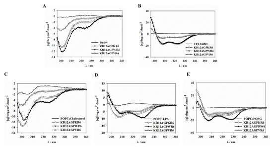 Circular dichroism spectra of the designed peptides. CD spectra were recorded at 60 µM concentration of KR12AGPKR6, KR12AGPWR6 and KR12AGPVR6 in (A) 20 mM phosphate buffer, (B) 30% TFE buffer, (C) 1 mM POPC/cholesterol, (D) 1 mM POPC/LPS and (E) 1 mM POPC/POPG LUVs at pH7.4, 25 °C.