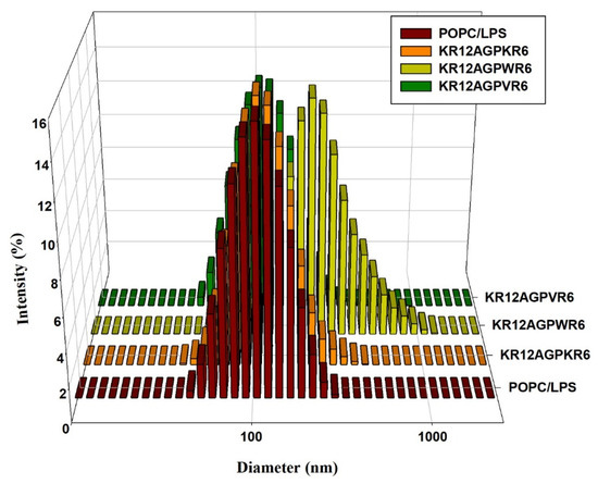 Size distribution of LPS aggregates in the presence of the designed peptides. Plots showed the size alterations of LPS aggregates in the absence or presence of KR12AGPKR6, KR12AGPWR6 and KR12AGPVR6 in 25 μM POPC/LPS solutions.