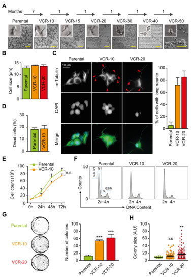 Establishment and characterization of vincristine-resistant neuroblastoma Be2c cells. (A) Neuroblastoma Be2c cells were cultured for 7 months with gradually increased concentrations of vincristine (VCR) (1–10 ng/mL). Cell lines with an even higher degree of resistance were subsequently created by additional subculturing in 15–50 ng/mL VCR containing media. Representative light microscopy images are reported. Scale bar = 5 mm; (B) Cell size was evaluated using the automatic cell counter Countess from Invitrogen. Quantitative results (mean ± SEM, n = 3) are shown; (C) Cell shape and cytoskeleton were evaluated by α-tubulin immunofluorescence staining. Neurites are indicated with red arrows. Neurite outgrowth is calculated by the number of cells with cell processes longer than the length of two cell bodies (mean ± SEM, n = 2); (D) Cell viability was assessed using propidium iodide staining (mean ± SEM, n = 3); (E) Cell proliferation was assessed using a cell counter (mean ± SEM, n = 3); (F) Representative cell cycle histograms For of parental, 10 and 20 ng/mL VCR-resistant cells. (G) Parental, 10 and 20 ng/mL VCR-resistant cells were seeded at a low cell density for clonogenic determinations. Representative wells from a 6-well plate with the different cell lines are shown. Graph displays averaged numbers of colonies from n = 3 (mean ± SEM); (H) Measurement of colony size comparing parental, 10 and 20 ng/mL VCR-resistant cells. (A.U. for arbitrary unit) (mean ± SEM, n = 3). n.s., non-significant. ** p < 0.01, *** p < 0.001 as compared with parental control cells (ANOVA, Tukey’s test).