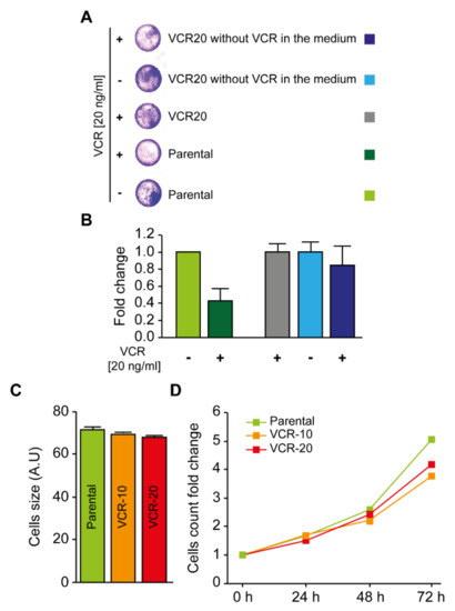 The mechanism of drug resistance is not immediately reversible upon cell release from drug. (A,B) Parental and 20 ng/mL VCR-resistant neuroblastoma cells were cultured for 3 weeks in a vincristine-free medium. Cells were seeded and treated for 48 h with 20 ng/mL vincristine for a crystal violet proliferation assay. Twenty ng/mL VCR-resistant cells kept in medium with vincristine were used as a control. Representative pictures of wells per condition are reported in (A), while the graph in (B) depicts the fold change in the absorbance at 595 nm of the treated cells as compared with non-treated cells. The green column illustrates the non-treated parental cells. The dark green column illustrates the parental cells treated with 20 ng/mL vincristine. The grey column illustrates the 20 ng/mL VCR-resistant cells kept in medium with vincristine. The blue column illustrates the 20 ng/mL VCR-resistant cells cultured for 3 weeks in vincristine-free medium. The dark blue column illustrates the 20 ng/mL VCR-resistant cells cultured for 3 weeks in vincristine-free medium, and then treated for 48 h with 20 ng/mL vincristine; (C) Parental, 10 and 20 ng/mL VCR-resistant neuroblastoma cells (labelled in green, orange, and red, respectively) were collected for cell size cytofluorometric assessment. Arithmetic means (±SEM, n = 3) of the cells forward scatter (FSC) are reported. Forward scatter is indicative of cell size; (D) Cells were seeded in 12-well plates at the exact density of 5 × 104 cells/well. Every 24 h, for 3 days, cells were collected and acquired by FACS. The corresponding number of events characterized by normal forward scatter (FSC) and side scatter (SSC) was determined.