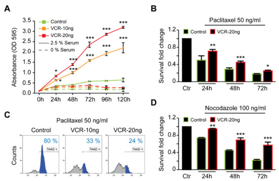 Next, we investigated whether the vincristine-resistant cells were able to grow in reduced serum conditions. While both resistant and parental cells were unable to proliferate in the absence of serum (0% serum, Figure 3A), resistant cells could grow and divide in reduced serum media (2.5%), which was not observed for parental cells (Figure 3A). Subsequently, we explored whether the vincristine-resistant cell lines were also resistant to other microtubule-destabilizing drugs such as nocodazole and paclitaxel. Time-dependent studies of nocodazole and paclitaxel treatments demonstrated that Be2c-VCR cells were more resistant to these drugs than parental cells (Figure 3B,D). Assaying cell death by 7-AAD staining also revealed a higher percentage of dead (7-AAD positive) cells for paclitaxel-treated parental cells (Figure 3C, left panel) than for the vincristine-resistant cells (Figure 3C, middle and right panels). In addition, the half maximal inhibitory concentration (IC50) values of other chemo agents clinically used for NB treatment, such as etoposide and cisplatin, were also slightly higher for VCR-resistant cells (Table 2).