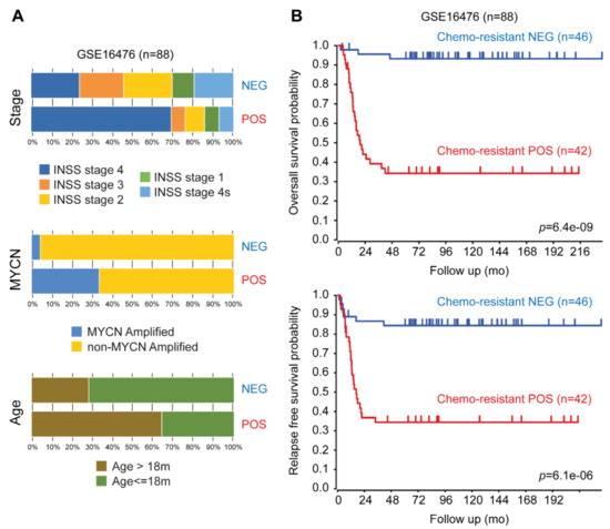 Chemoresistant POS groups have worse overall survival probabilities as compared with chemoresistant NEG and worse relapse-free survival probabilities over time. (A) The stacked bar plot shows the phenotypic features of samples in GSE16476 stratified by k-means clusters. For this dataset we report the International Neuroblastoma Staging System (INSS) Stage, MYCN amplification status, and age at diagnosis grouped by the 18 months cutoff. (B) Kaplan–Meier curves calculated by the log-rank test showing the overall and the relapse-free survival probabilities for GSE16476. p-values were calculated with log-rank test. All the analyses were performed on the R2 web platform (http://r2.amc.nl).