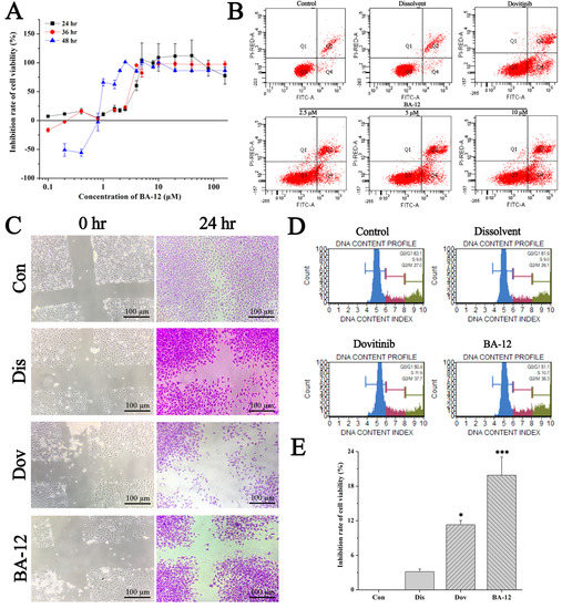 The in vitro antitumor activity of BA-12 on T24 cells. (A) Inhibition rate of cell viability of T24 cells for MTT assays (cells treated with BA-12 at doses of 0.25–160 μM) for 24, 48, and 72 h. (B) Apoptosis analysis of T24 cells induced by agents using Annexin V-fluorescein isothiocyanate (FITC)/propidium iodide (PI) staining. (C) Results for wound scratch assay (cells treated with BA-12 at doses of 2.5 μM) after 24 h under the microscope (100×). The most representative fields are shown. (D) Cell cycle analysis using PI staining (cells treated with BA-12 at doses of 2.5 μM). (E) Inhibition rate of cell viability of T24 cells for MTT assays (cells treated with BA-12 at doses of 2.5 μM) for 24 h. ANOVA with a post hoc test was used to calculate the significance of the differences; * p < 0.05, *** p < 0.001 compared with the dissolvent group. Experiments were executed three times. Results are displayed as means ± SD.