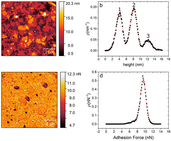 In Figure 1 we show an AFM image of DPPC as deposited over silicon and force spectroscopy curves obtained on the different evaporated regions using quantitative imaging (QITM) mode. Figure 1a shows the island-like topography of the sample right after the evaporation process. Figure 1b shows a height distribution of the topography, from where we can identify three clearly separated height levels. From these height distributions we obtain the three main peaks centred at 4.01 ± 0.93 nm (level 1), 8.08 ± 0.94 nm (level 2) and 12.17 ± 0.98 nm (level 3). These step heights are multiples of 4 nm, which is the characteristic height of a DPPC bilayers [26,33]. Figure 1c shows an adhesion map of the same region, while Figure 1d shows an adhesion distribution. From Figure 1d, we can say that the entire surface is covered with a layer that has roughly the same adhesion, i.e., only one peak is seen centred at 9 nN, this is higher than our measured value for the bare silicon substrate, on which we measure an adhesion force of 5 nN (Figure S12).