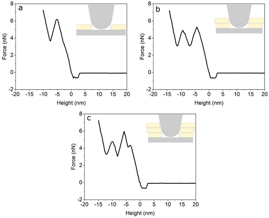 In order to test the mechanical properties of the membrane in Figure 1, we performed force curves using AFM [34]. Figure 2 shows representative AFM force curves taken using force mapping mode on a 7 µm × 7 µm area. Breakthrough events are seen as sudden drops in the force curves. These breakthrough events are seen at all points, and show 1, 2 or 3 breakthrough events (Figure 2a–c), respectively. Force curves with one breakthrough are attributed to the rupture of the first level, i.e., only one bilayer (Figure 2a). Meanwhile, force curves with two and three breakthrough events are related to ruptures in levels 2 and 3 (Figure 2b,c). The rupture forces show that we have a complete coverage of the substrate with one DPPC bilayer, i.e., we always see at least one rupture event. On top of this complete bilayer we have partial coverage of two and three additional bilayers (see Figure 1a). By averaging all curves with one rupture we obtain an average of 5.3 ± 2.4 nN. Force curves showing two ruptures (level two) show a first rupture at 5.6 ± 1.2 nN followed by a second rupture at 5.1 ± 1.1 nN. Finally, force curves with three rupture events (level 3) rupture first at 5.3 ± 2.0 nN, followed by a second rupture at 5.2 ± 1.8 nN and a third rupture at 5.0 ± 1.7 nN. As seen, all ruptures in dry, non-hydrated SLBs occur around 5nN and are independent of the number of layers. The averages and individual rupture forces are tabulated in Tables S1–S3. To compare the mechanical properties of SLBs immersed in liquid, we applied AFM force curves to phospholipid bilayers fabricated under the same procedure (formed by physical vapour deposition in high vacuum) immersed in pure water in the AFM JPK NanoWizardTM Heating Cooling Module HCMTM accessory. We applied tip forces up to 15 nN and no rupture of the bilayer membrane was observed (see Figure S1).
