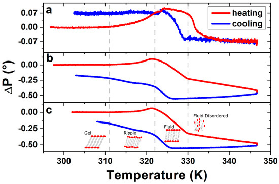 To confirm the DPPC bilayer formation, complementary ellipsometric measurements were performed in order to observe phase transitions, by applying heating and cooling temperature ramps between room temperature (RT) and 347 K. Figure 3 shows the variations in the polarizer angle (ΔP), which represents variations in the polarizability of the bilayer molecules [35]. The ellipsometric data permits, based on the models of Paul Drude [36] and the equivalent model [37] of Dignam and Fedyk [35], an interpretation of the collective behaviour on a molecular scale. Figure 3a corresponds to the first temperature ramp applied to the sample of ~60 Å DPPC on SiO2/Si, while Figure 3b,c show the data obtained during the second and third heating ramp, respectively.