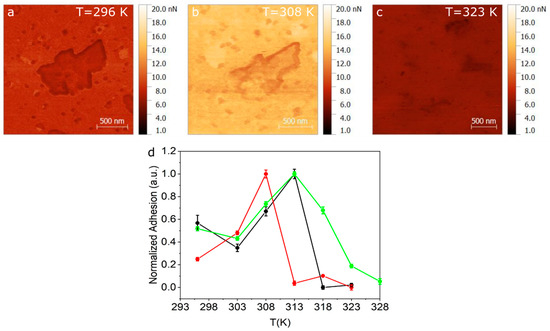 Adhesion maps obtained using QITM mode for (a) 296 K (b) 308 K and (c) 323 K. (d) Normalized adhesion taken for three different samples as a function of temperature.