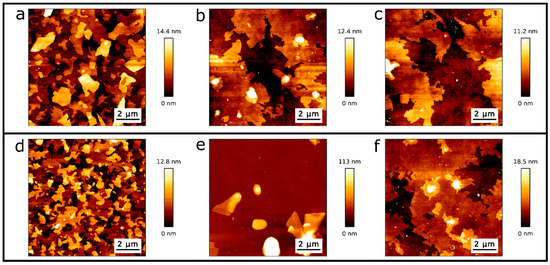 AFM topography images of the DPPC bilayer taken at RT in air during consecutive measurements in the same scan region (2 µm × 2 µm) to induce the reduction of the island-like DPPC bilayer surface area, applying two different tip forces, (a–c): 1 nN; (d–f): 3 nN.