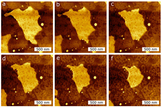 Figure 5 AFM topography images lead us to believe that the AFM tip is interacting with the SLB in air, affecting its morphology and roughness, during the heating cycle. Restructuring of an SLB on mica due to tip interactions has been reported on DODAB, DOPC and DPPC on mica in liquid [38,39]. It is important to emphasize that in the AFM images seen in Figure 5a–d and in Figure 5f, that the first layer, corresponding to a height of 0 nm, contains a complete phospholipid bilayer, which was confirmed by the observation of a single rupture event in the force curves. Meanwhile in Figure 5e there is no DPPC bilayer in the first height layer, since it was removed and piled up due to the interaction between the AFM tip and the sample during the temperature cycle. This was confirmed by force curves which do not show a rupture event.