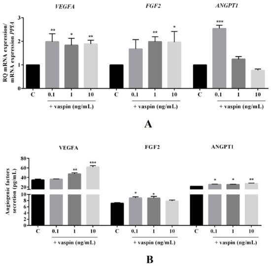 Dose-dependent effect of vaspin on luteal cell angiogenesis. The cells were treated with 0.1, 1, and 10 ng/mL of vaspin for 24 h, and then PCR, ELISA and western blot analysis were performed to determine mRNA levels and secretion of endothelial growth factor (VEGFA), fibroblast growth factor 2 (FGF2), and angiopoietin (ANGPT1) (A,B) or endothelial growth factor receptors 1 and 2 (VEGFR1 and VEGFR2) protein expression (C). Gene expression levels were normalized to cyclophylin A (PPIA), while proteins to actin. Experiments were independently performed and repeated four times (n = 4). The data are plotted as the means ± SEM. Significance between control and vaspin treatments is indicated by * p < 0.05, ** p < 0.01, and *** p < 0.001; Control (C).